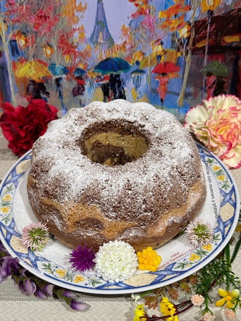 Echamos en un molde, untado con aceite y espolvoreado con harina, un poco de la composición con cacao, encima un poco de masa amarilla, otro poco de masa con cacao… y así hasta acabar las dos masas.