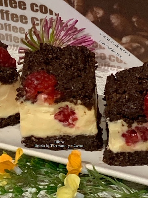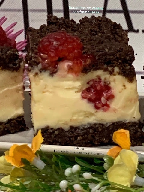 – Ponemos por encima las frambuesas lavadas y secas y las apretamos un poco en la crema.– Echamos por encima la crema restante y extendemos.