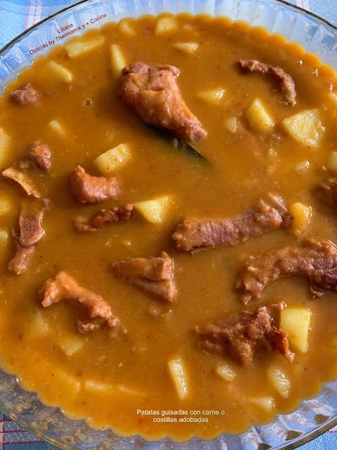 Aquí tenemos unas ricas patatas guisadas con carne o con costillas adobadas, nos han encantado. Fáciles y rápidas de hacer.