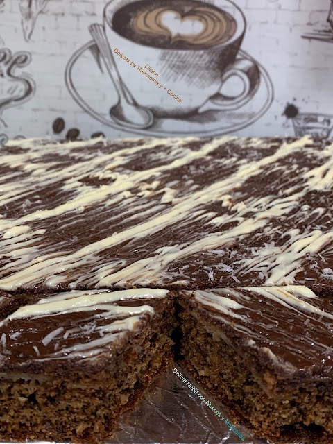 – Cuando el bizcocho está ya frio podemos espolvorear con azúcar glass por encima o preparar un glaseado de chocolate. Yo he hecho glaseado de chocolate negro y glaseado de chocolate blanco. En un bol echamos el chocolate negro en trocitos y lo calentamos un poco en el microondas. Añadimos unos trocitos de mantequilla, calentamos en microondas hasta coger la consistencia deseada. Hacemos lo mismo con el chocolate blanco. Mezclamos bien y echamos por encima de nuestro bizcocho en bandas no muy anchas y luego pasamos un tenedor por encima para juntarlas, las de chocolate blanco y las de chocolate negro.