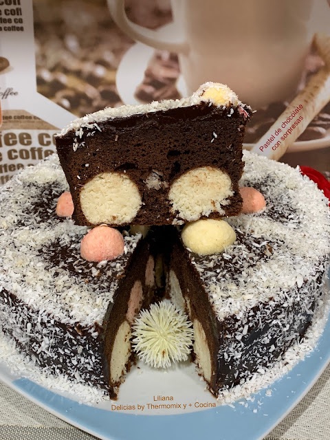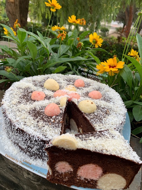Para hoy querid@s amig@s os recomiendo este rico pastel de chocolate con sorpresas en su interior. Para mi una buena sorpresa en la pastelería, como ya lo he contado varías veces es el coco, un vicio muy adictivo.