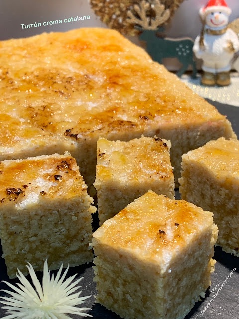 – Cuando nuestro turrón está frío desmoldamos, espolvoreamos con azúcar y quemamos con un soplete. Podemos hacer unas rallas con un cuchillo.