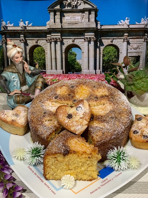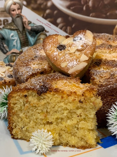 – Echamos la masa en el molde, unos 3/4 de su capacidad, preparado antes y por encima he echado unas rodajas de naranja, gotas de chocolate y coco rallado.