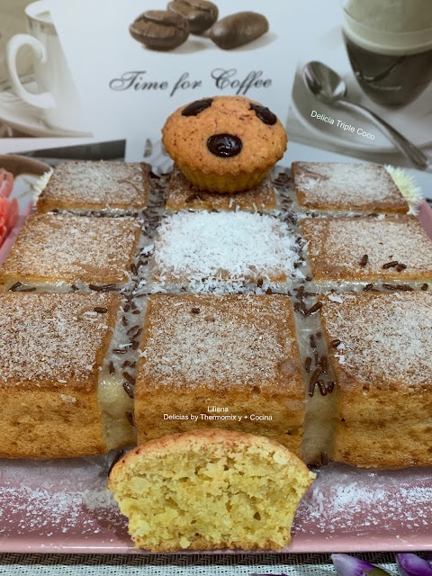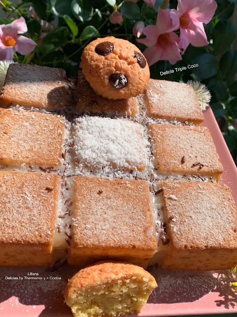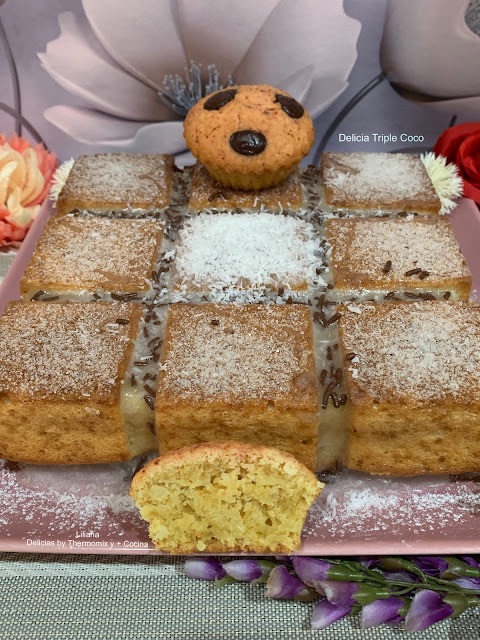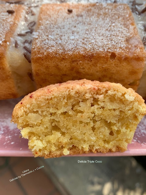 Como ya sabéis el coco es mi debilidad, así que hoy os propongo este rico bizcocho triple coco, con coco natural. Queda tan tierno y esponjoso que se deshace solo en la boca.