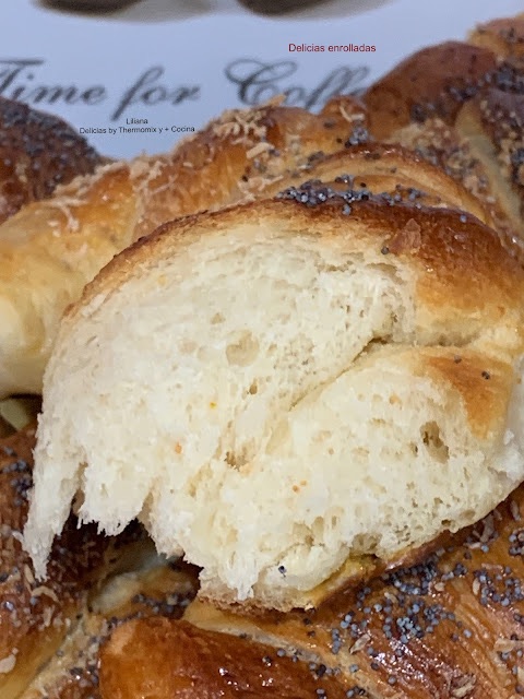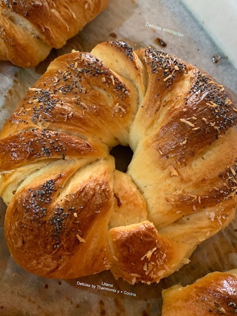 – Enrollamos y juntamos los laterales, sellándolas, o los podemos dejar en semicírculo. Los colocamos en la bandeja del horno tapada con papel de horno.