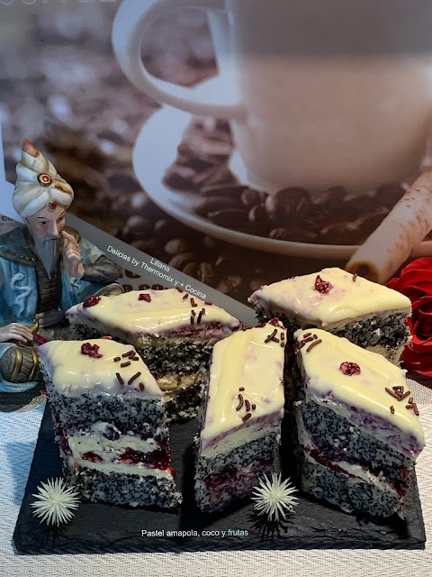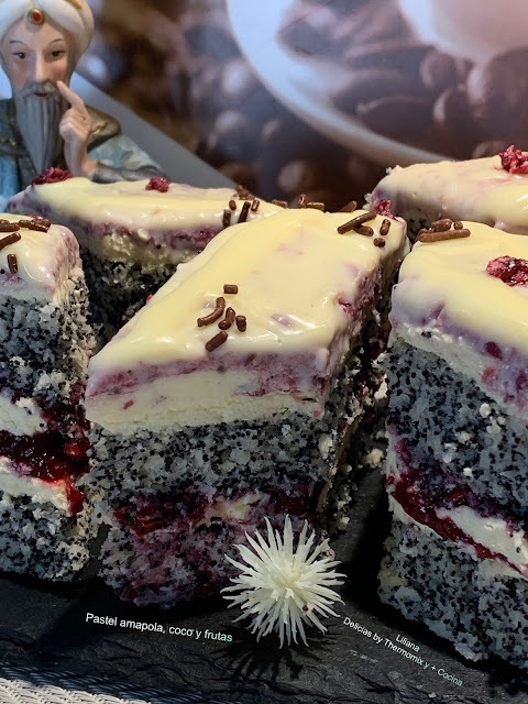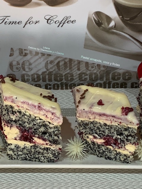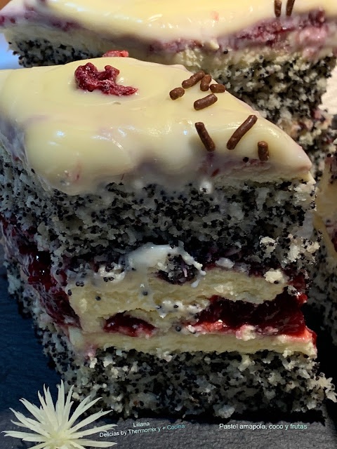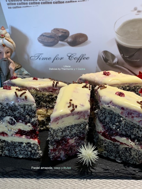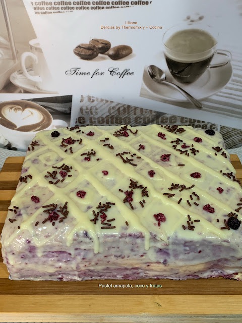 Pastel amapola, coco y frutas