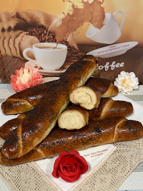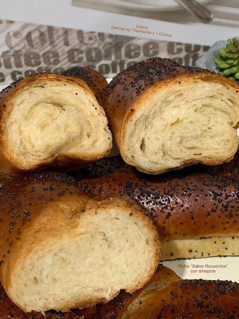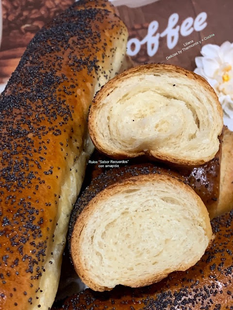 – Pincelamos los otros dos rulos con la yema batida y los espolvoreamos con semillas de amapola. Horneamos unos 30 min. a 180ºC, depende de cada horno. Al sacarlos del horno los pincelamos con miel y a disfrutar de nuestros ricos rulos al lado de una taza de café, cola-cao…