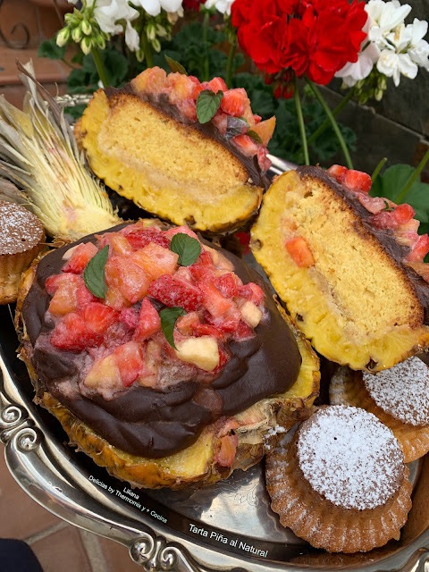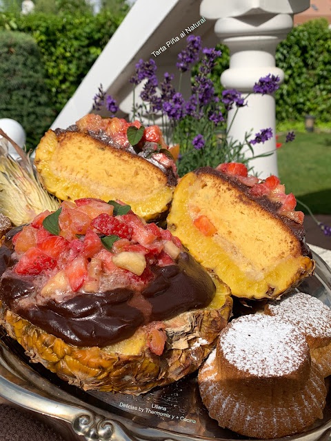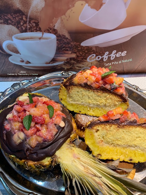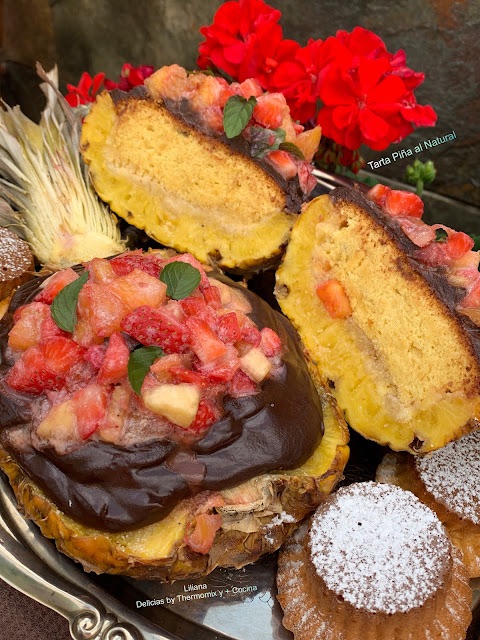Para hoy os propongo un rico pastel de piña horneado en la misma cáscara de la piña. Una rica combinación entre el bizcocho de piña, el chocolate y la ensalada de frutas.