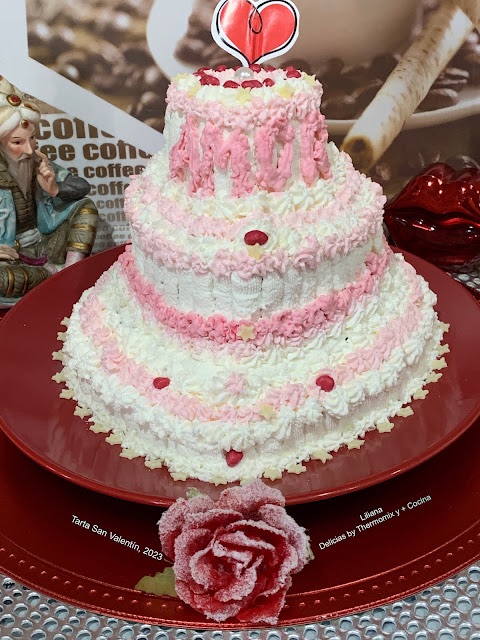 – Sacamos la tarta de la nevera y decoramos a nuestro gusto. De primero vamos a adornar con la nata blanca y luego hacemos unos adornos con nata rosita, a nuestro gusto.