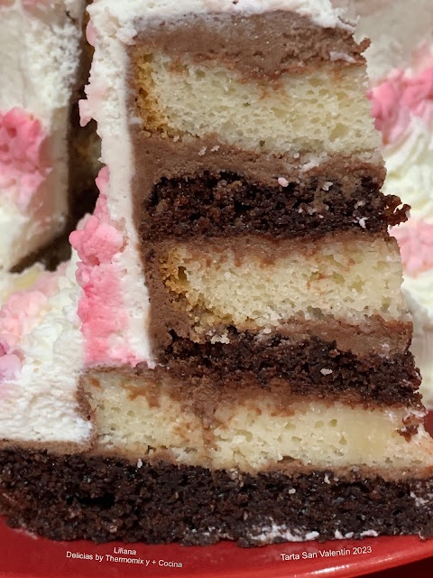 – Horneamos el bizcocho, en el horno precalentado a 180ºC, unos 35 min. y los últimos 10 min. subimos a 185ºC., depende del horno. Hacemos el test con el palillo, si sale seco nuestro bizcocho está listo. Yo en los últimos minutos lo he tapado con papel de horno para no quemarse por encima. A continuación horneamos el bizcocho corazón y las magdalenas, unos 30 min. a 180ºC. Hacemos el test con el palillo, las magdalenas las sacamos un poco antes.