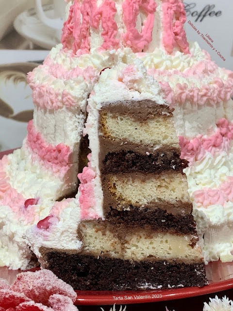 – Ponemos una plancha de bizcocho con cacao sobre un plato, echamos crema y nivelamos. Seguimos con otra plancha de bizcocho de coco, rellenamos con crema y así hasta acabar todas las planchas de bizcocho.