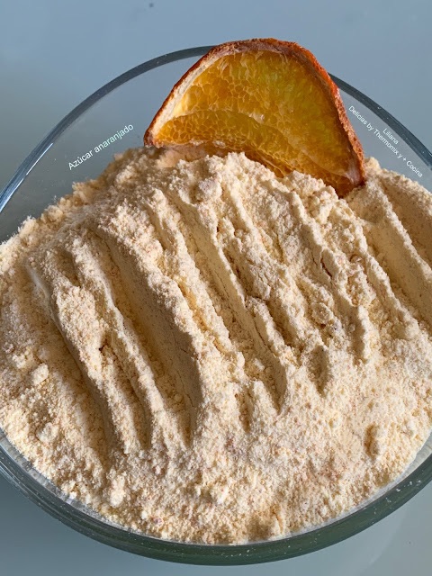 Por eso he pensado, haciéndome un zumo, porque no quitar la corteza antes y secarla. Dicho y hecho. Con la piel de naranja ya seca, en una bolsita, tenia que hacer azúcar glass y ya está…he triturado el azúcar junto con la piel de naranja y tan contenta ahora. Abro el bote y te invade el olor a naranja.