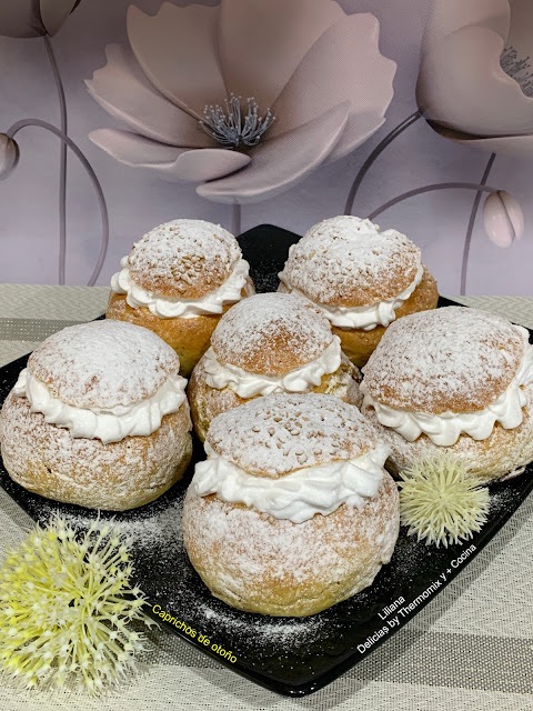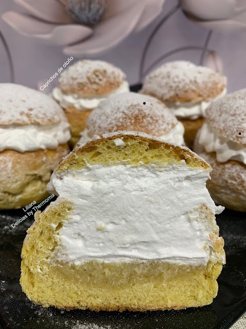 Oís invito a desayunar estos ricos bollitos con nata y almendras.