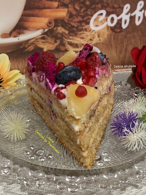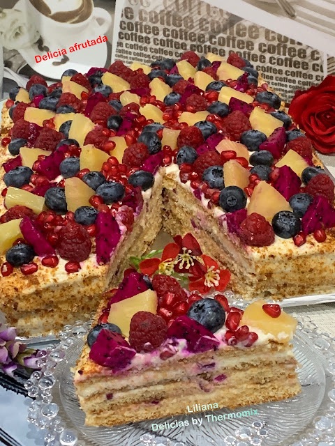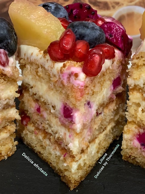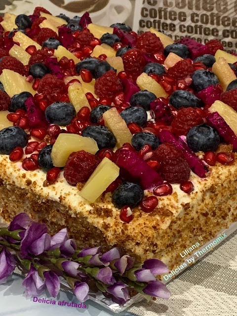 Si oís gusta las frutas, esta tarta, postre, la recomiendo de corazón. Es una combinación perfecta entre la dulzura de la miel y el sabor agridulce de las frutas, pitaya, granada, piña de conserva, o las frutas que os apetecen.