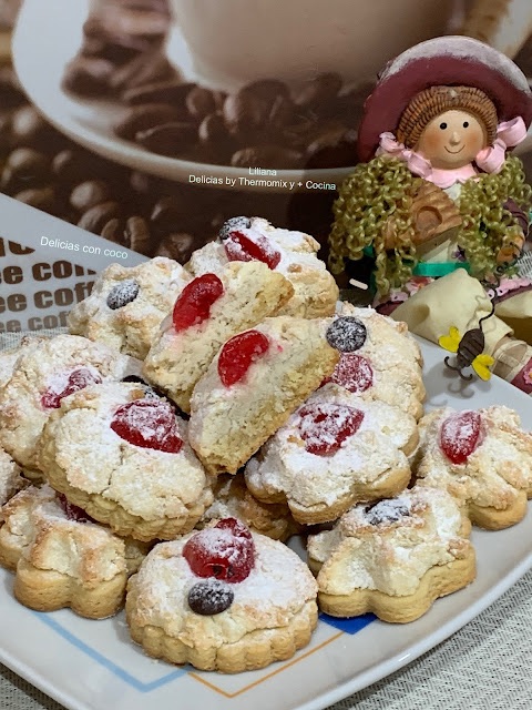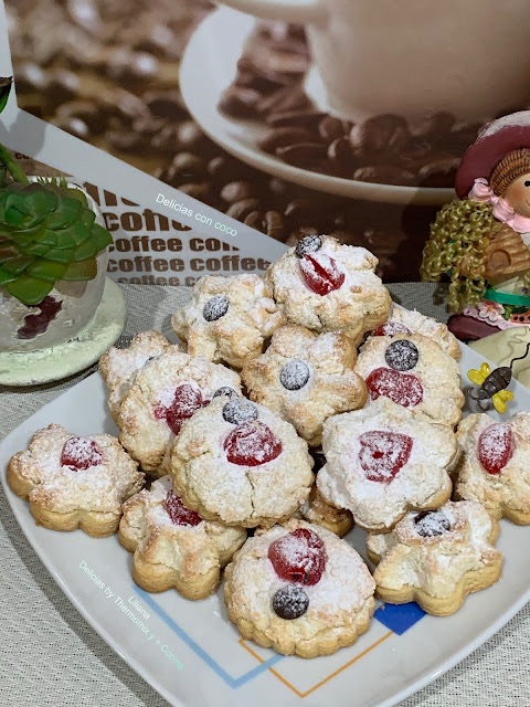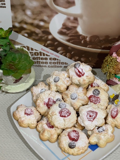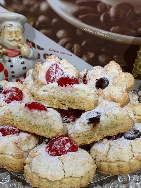 También se pueden mezclar las dos masas, muy poquito, extendemos la masa y cortamos con las formas deseadas. Echamos por encima gotas de chocolate o mitades de cerezas en almíbar y horneamos. Sacamos del horno, dejamos enfriar y espolvoreamos con azúcar glass.Horneamos unos 12 min. a 180ºC.