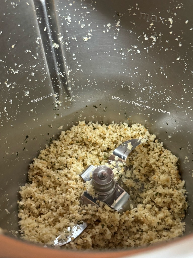 – Echamos en el vaso thermomix los ajos, el perejil y las rodajas de pan en trozos 6 seg./vel.6. Volvemos a poner 5 seg./vel.7. Depende de la dureza del pan.