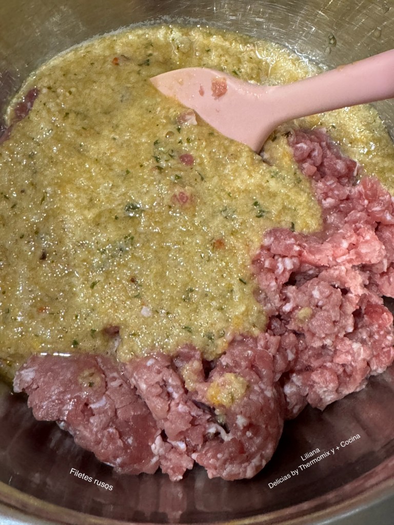 – En un bol donde tenemos la carne picada, echamos la mezcla y mezclamos hasta incorporarse todo bien.