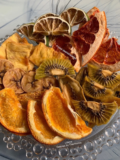 Echamos las frutas en rodajas, deshidratadas ya en el vaso de nuestro querido ayudante, Thermomix, y trituramos unos 3 seg./vel.6. Si las queréis más finitas repetir la operación 1 o 2 segundos mas.