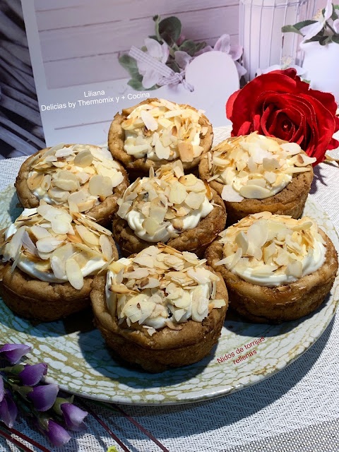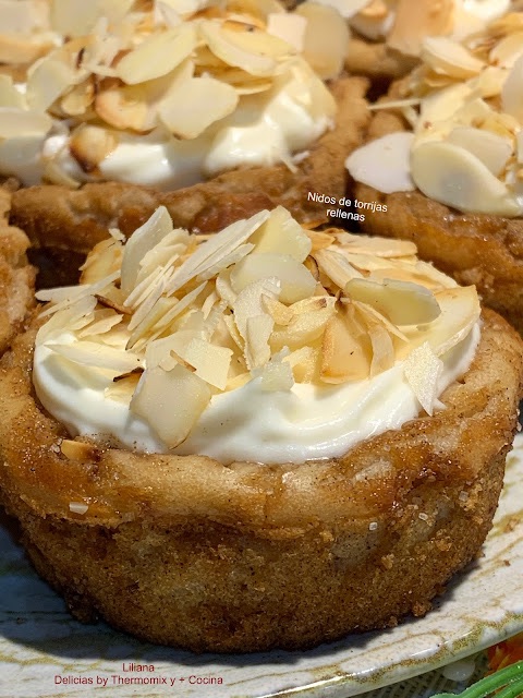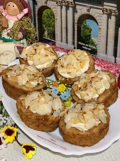 – En el hueco de nuestros nidos echamos un poco de crema con la ayuda de una manga pastelera y decoramos con las almendras laminadas tostadas.