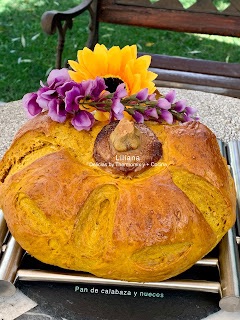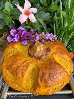 – Añadimos las nueces picadas, los 150g.de la mezcla de harinas y la sal 10 seg./vel.6.La cantidad de harina depende de la humedad de la calabaza.