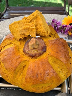 – Cuando a doblado el volumen sacamos la masa del bol, amasamos un poco y hacemos un bola. En el centro, con la ayuda de un cortador redondo hacemos un agujero y ponemos el rabito de la calabaza, claro, lavado y secado. Damos unos cortes a la masa y dejamos levar unos minutos.