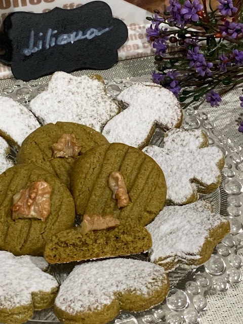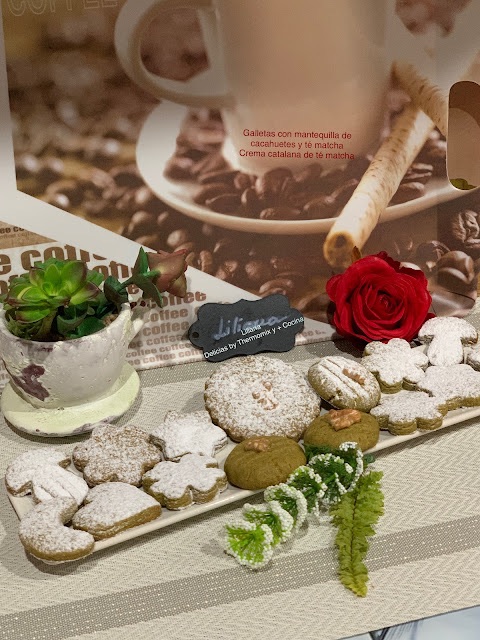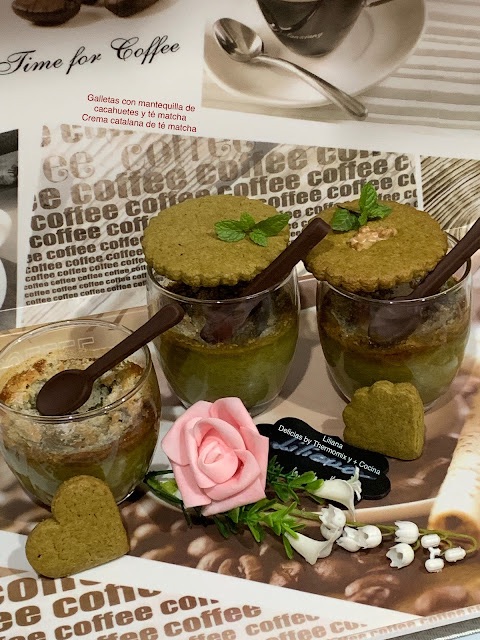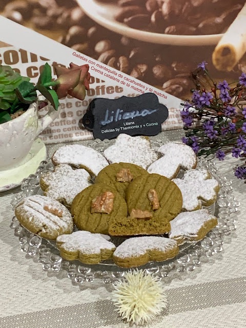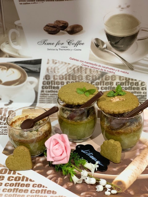 Galletas con mantequilla de cacahuetes y té matcha y crema catalana de té matcha