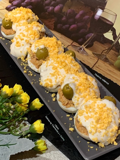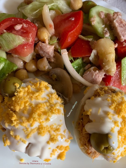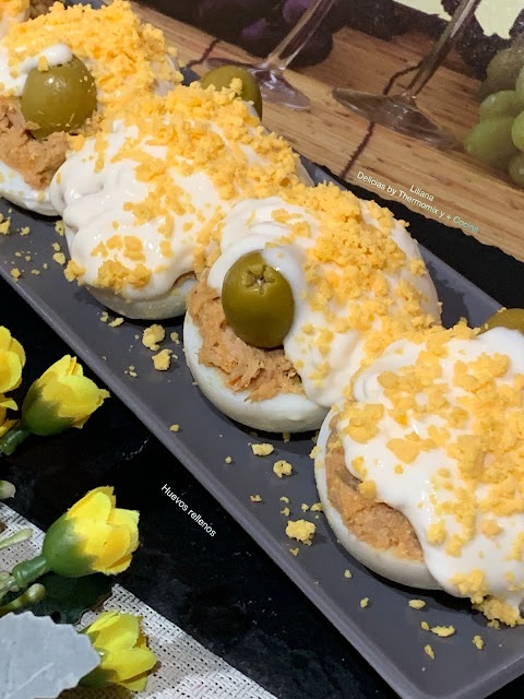 – Rellenamos las mitades de las claras con la mezcla anterior decoramos con mayonesa con huevo rallado y echamos una aceituna encima, o a gusto de cada uno.