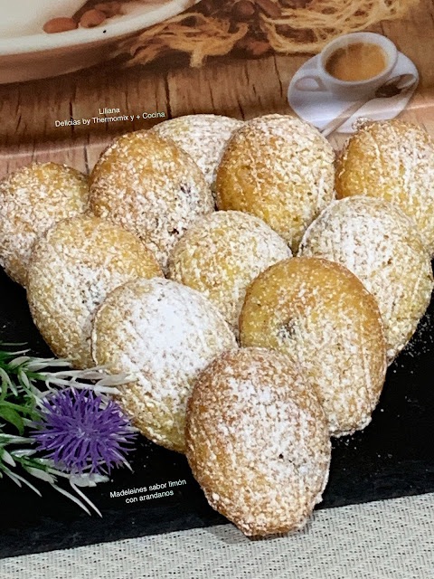 – Ponemos la mariposa en las cuchillas y echamos los huevos y el azúcar glas, 10 min./vel.3,5.- Añadimos la ralladura de limón y la pizca de sal 3 min./vel.4. La masa tiene que triplicar el volumen más o menos y queda como una crema. Quitamos la mariposa.- Añadimos la mitad de la harina, tamizada, 30 seg./vel.espiga.- Añadimos la mitad de mantequilla derretida, 30 seg./vel.espiga.- Añadimos la otra mitad de harina 30 seg./vel.espiga. – Añadimos el resto de mantequilla y mezclamos con la espátula con movimientos envolventes de abajo hacia arriba siempre.- Sacamos en un bol y tapamos con film transparente por encima de la masa y reservamos en la nevera por lo menos una hora. Se puede hacer y la tarde anterior y guardamos en la nevera.- Con la ayuda de dos cucharaditas rellenamos unos 3/4 de los moldes de silicona y echamos por encima los arándanos o frutos rojos, picaditos y nivelamos con la cucharadita.- Horneamos a 180ºC unos 12-15 min.,depende del horno, hasta tener los laterales dorados y en el medio tierno a probarlo. Hasta hornear las primeras la masa que a quedado la guardamos tapada en la nevera.- Seguimos horneando el resto de masa usando los moldes limpios.- Dejamos unos 5 min. a enfriar y las sacamos de los moldes y dejamos enfriar por completo.- Son un poco crujientes en el exterior pero tiernas en el interior.- Las podemos dejar así o pulverizar azúcar glas o glaseadas con chocolate.- Se conservan en una caja tapada, separadas con papel de horno para no pegarse entre ellas, unos 5-7 días, si aguantan sin comerlas.BUEN APETIT.