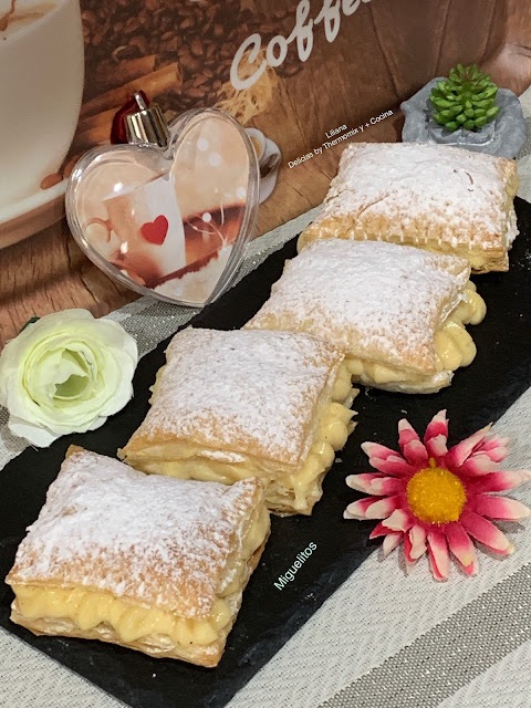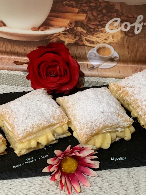 – Cuando están fríos los cuadraditos los cortamos por la mitad y los rellenamos con la crema pastelera. Espolvoreamos con azúcar glas. Mantenemos en la nevera hasta la hora de servir.