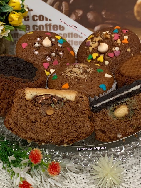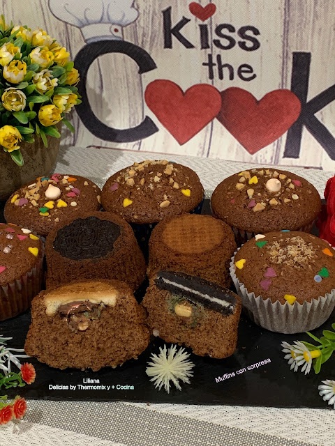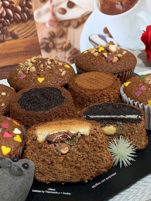 – En una bandeja para magdalenas ponemos papelitos. En el fondo ponemos una galleta Oreo o de otro tipo con crema, bombones con cacahuetes y echamos 2 cucharadas de masa de magdalenas. Encima echamos caramelitos de colores.