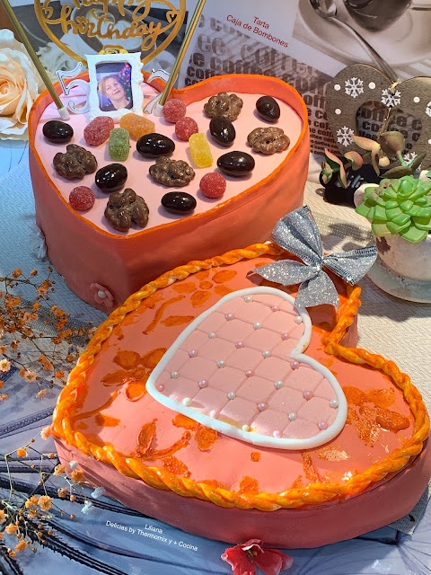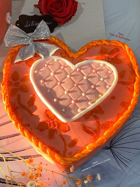 – Vamos a hacer 2 tartas, una la caja y la otra la tapa. Para la caja vamos a necesitar 4 círculos y para la tapa 2. Cortamos dos cartónes con forma de corazón con las medida de las tartas y los envolvemos con papel de aluminio. Rellenamos con el ganache de chocolate. Yo para la tapa he batido un poco de nata y ganache para tener dos rellenos diferentes, uno con ganache y el otro con nata y chocolate.