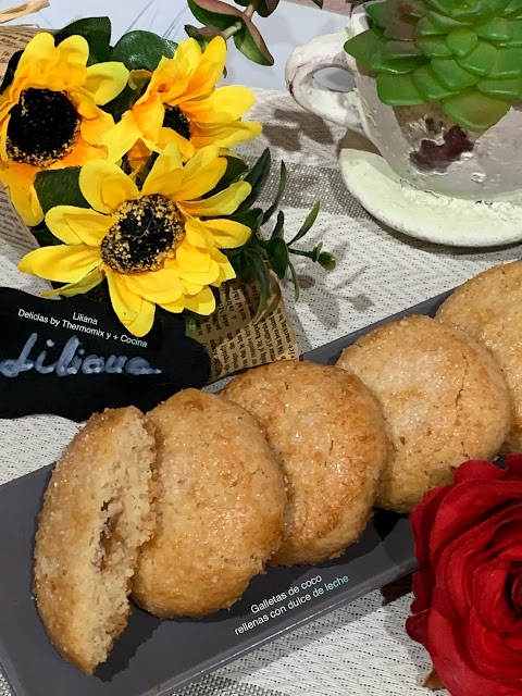 Como muchos ya lo sabéis el coco es mi perdición. Hace tiempo he comprado en Mercadona unas galletas de coco que me han encantado por su textura. Las he intentado hacer varias veces pero no daba con esa textura. Pero hoy por fin he conseguido una textura más o menos parecida así que aquí tenéis las galletas de coco rellenas con dulce de leche.
