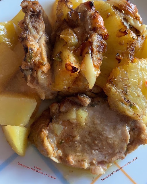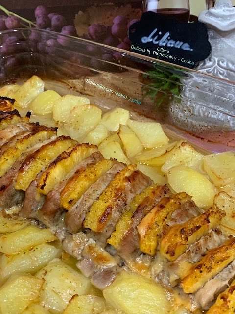 – Partimos el solomillo en filetes sin llegar al final, lo colocamos en el medio de la bandeja y entre filete y filete metemos un trozo de queso y un trozo de piña. Echamos por encima el jugo de la piña, un poco de aceite, sal y pimienta molida.